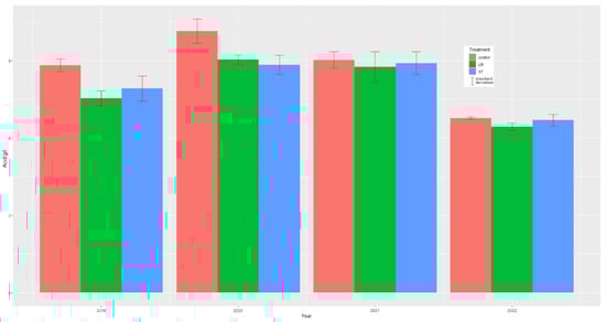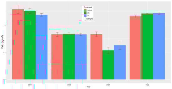 The homogeneity of variances and the distribution of the harvest results data (normality test) were checked by the Levene test and Shapiro–Wilk test, respectively, and then, as these do not meet the basic conditions for standard ANOVA, data were evaluated by Aligned Rank Transformed ANOVA [28] by 3 factors: treatment (LR, ST, and control):year (2019–2022) and cultivar (Pinot noir, Welshriesling). Where the ART–ANOVA results indicated that the expected values differed at a significance level of at least 90%, the expected values were compared pairwise using the “Aligned Ranked Transform Contrasts” test [28,29]. All of the results were analysed and evaluated using the R software package [30]. The graphs were conducted using the ggplot2 package [31].