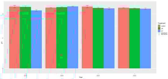 Effect of different treatments (LF = Leaf Removal; ST = Short Topping) on the pH of Welshriesling grape juice in different years (Badacsony, 2019–2022).