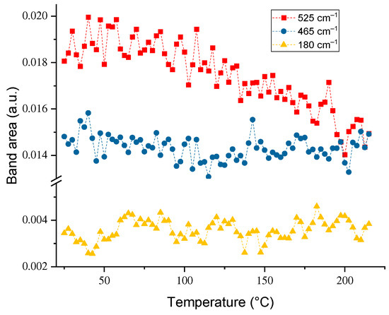 | Band Maximum *, cm−1 | Band Intensities and Changes of Integral Intensity with Temperature * | SiO2/Mineral and Water Constituents | Organic Matter |