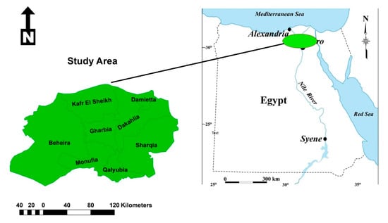 The study was carried out in the Egyptian Delta in 2022–2023, which is in Egypt’s northern region, as shown in Figure 1. The Egyptian Delta lies between longitudes from 29°37′54″ E to 32°55′49″ E and latitudes from 29°37′49″ N to 31°41′2″ N. In the Delta of Egypt, the average arable land area and the number of householders in small areas (less than 2 ha) are 964,550 hectares and 2,643,124 households, respectively. The Delta region has a mild climate with an average temperature of 25 degrees; from 100 to 200 mm of rain falls during an average year, and most of this falls in the winter months. Winter wheat production dominates most of its arable lands, so wheat was selected for the study.
