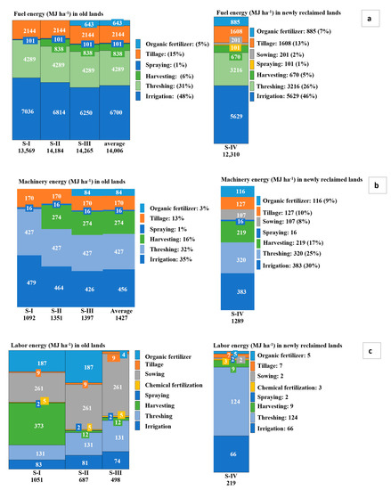 The highest labor energy was in S-I (1051 MJ ha−1) and the lowest was in S-IV (498 MJ ha−1) (Figure 3c). Regarding the organic fertilization process, the S-I and S-II scenarios had the highest labor consumption with a value of 187 MJ ha−1, because organic fertilization of the crop was performed by broadcasting (manual), while the S-III and S-IV scenarios were the lowest in labor consumption, with an average of 5 MJ ha−1, due to the use of mechanization in the organic fertilization. There is no noticeable change in the use of workers in plowing because they use the chisel plow in preparing the soil for cultivation in all scenarios. As for sowing, the scenarios of the old lands consume labor energy with a value of 261 MJ ha−1, because they all depend on sowing by hand. As for the S-IV scenario, sowing consumes the least labor energy, with a value of 2 MJ ha−1, because of using mechanization in the cultivation process. In all scenarios, fertilization consumes a small amount of labor energy, valued at 5 MJ ha−1, because farmers spread fertilizers while carrying out the irrigation process, which does not consume much time. Spraying was carried out by knapsack or spray motor in all scenarios, where the average spraying energy was about 2 MJ ha−1. Harvesting was done by a simple harvester in S-II, S-III, and S-IV, while in S-I, the harvesting was accomplished by a hand sickle, making it labor-intensive with a value of 373 MJ ha−1. In all scenarios, a tractor-mounted thresher is used. The maximum threshing energy was 131 MJ ha−1 in S-I, S-II, and S-III, while the minimum was 126 MJ ha−1 in S-IV. As for irrigation, it needs a little more labor energy in the old lands, because it depends on flood irrigation. As for most of the newly reclaimed lands, farmers depend on modern irrigation, which maximizes the efficiency of using water and fertilizers.