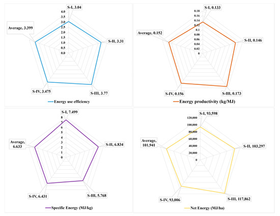 As for indirect energy inputs, chemical fertilizers ranked first for input energy in wheat production at 36.35 and 34.74% in S-I and S-II, respectively, and ranked second at 32.61% in S-III. The agricultural machinery differed in each scenario because of the difference in the number of mechanization operations. The agricultural machinery energy was 1397 MJ ha−1 in S-III as the highest scenario, while it was the lowest in S-I at 1092 MJ ha−1. The manure energy value differed between the scenarios—871, 835, and 771 MJ ha−1 for S-I, S-II, and S-III, respectively—due to the difference between using labor and mechanizing the operation. As for the output energy, it was the highest in S-III (160,418 MJ ha−1), while it was the lowest in S-I (139,483 MJ ha−1). This is due to farmers’ use of harvesting machines in S-III, which reduces grain and straw losses, as mentioned in [44,45].