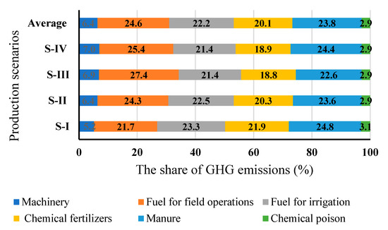 In this study, GHG equivalents were used to calculate GHG emissions of production inputs (kg CO2-eq ha−1) such as diesel fuel, fertilizers, manure, pesticides, and machinery. Table 3 presents the GHG equivalents (kg CO2-eq ha−1). Furthermore, the GHG emissions per MJ were calculated to compare crop production reaction to emissions.
