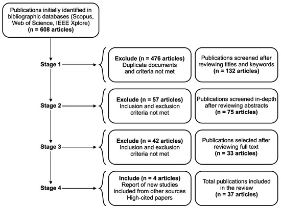 For the selection of the papers to be reviewed, the ICs and ECs previously presented in Table 2 were applied to the documents found in the scientific databases, with the help of technological tools for the selection of publications [37]. In the first stage, papers were selected by evaluating their title and keywords to exclude papers unrelated to the research questions. Also, duplicate papers were removed. In the second stage, the abstracts of the preselected documents from the previous stage were examined. Thus, each paper underwent evaluation by applying ICs and ECs to determine whether it would proceed to the next step. During the third stage, the complete text of the candidate documents was reviewed for final selection, and the papers that not met the established criteria were excluded from the review. In the fourth stage, the studies obtained from other sources were included, especially papers identified through snowballing applied to the studies selected in previous stages and retrieved through Google Scholar and ScienceDirect. At this stage, the papers with the highest number of citations for each query were also added. These papers are the starting point for many of the studies reviewed, and for their inclusion, we omitted the IC2 that limits the time window for publication of the papers, obtaining two high-impact papers. This completed the total number of papers included in the review. Figure 1 shows the flowchart of the papers’ selection process. Filters were applied to the selection process, where 35 papers were selected and 2 highly cited papers were added, for a total of 37 reviewed papers.