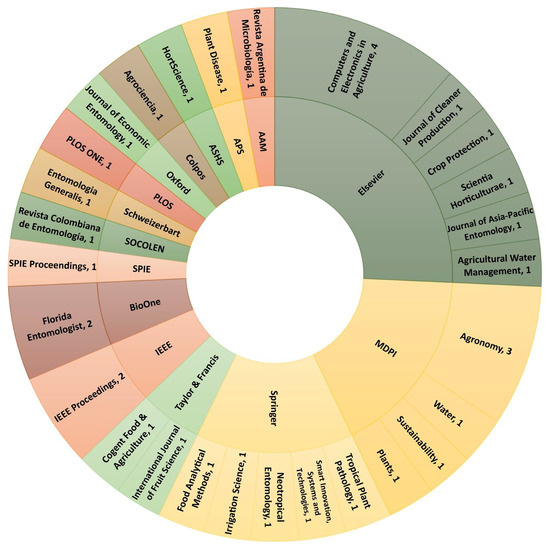 Based on the selection process, this SLR included a total of thirty-seven papers selected according to the eligibility criteria. The composition of the selected papers varies between publications in scientific journals and publications in conference proceedings. The journals with the highest number of selected articles are Computers and Electronics in Agriculture from Elsevier with four publications, and Agronomy from MDPI with three publications. These two publishers, together with Springer, account for about 57.14% of the selected studies, and the other publishers account for the remaining 42.86%. Figure 2 shows both the journals and the publishers with one or more publications selected for this SLR and related to the research questions. Thus, this figure shows the number of publications selected by each publisher in the first 35 selected papers.
