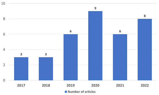Analyzing the publication type, 33 (89.18%) of the selected publications correspond to research papers in scientific journals, and 4 (10.82%) publications are papers in scientific conference proceedings. Most of the first 35 selected papers were published between 2020 and 2022, representing 65.71%. The remaining group of these papers (34.29%) was published between 2017 and 2019. Figure 3 illustrates the yearly distribution of the first 35 included papers in this study.