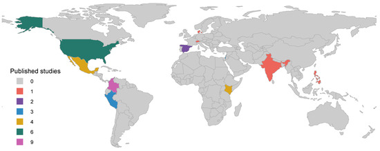 The distribution of the selected studies around the world is shown in Figure 4 and was conducted in 11 countries. The majority of the studies were from Colombia, with 9 papers (25.71%); followed by the United States, with 6 papers (17.14%); Mexico and Kenya, with 4 papers (11.43%) in each country; Peru and Israel, with 3 papers (8.57%) in each country; Spain; with 2 papers (5.71%); and closing with India, the Philippines, Switzerland, and Denmark, with 1 paper (2.86%) in each country.