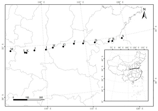Distribution of sampling sites. A, Lianyungang; B, Tancheng; C, Zaozhuang; D, Shanxian; E, Lankao; F, Zhengzhou; G, Luoyang; H, Sanmenxia; I, Tongguan; J, Jingyang; K, Fufeng; L, Baoji; M, Tianshui.
