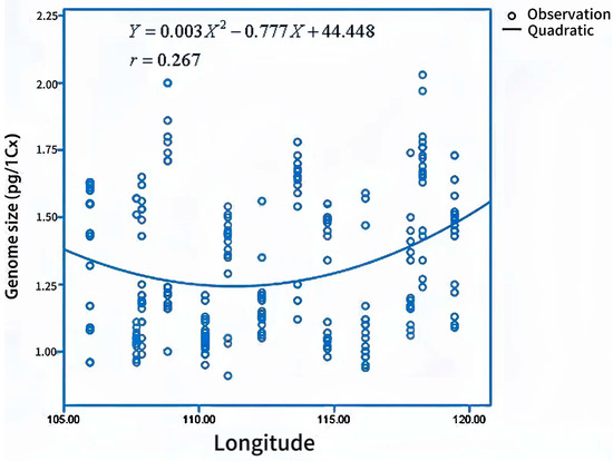 Genome size estimations of bermudagrass individuals ranged from 0.68 pg/1Cx in Baoji to 2.24 pg/1 Cx in Tancheng (Figure 2). The mean genome size of all bermudagrass individuals was 1.31 pg/1Cx (Table 2). Genome size was significantly correlated to longitude. The genome size would be smaller in regions at lower longitude, which indicated that longitude was an extremely important factor in genome size variation. The relationship between longitude and genome size was interpreted well by a quadratic curve (r = 0.267, p = 0.000) (Figure 3). In addition, genome size was significantly influenced by MAR (mean average rainfall). Bermudagrass individuals with a smaller genome size are more frequent in dry habitats. Regression analysis showed that the quadratic could explain the relationship between genome size and MAR (r = 0.350, p = 0.000) (Figure 4).