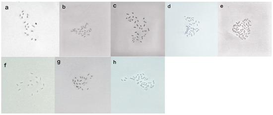 Mioic metaphase chromosomes of bermudagrass individuals with different ploidy levels as follows: (a) diploid (2n = 18); (b) triploid (2n = 27); (c) tetraploid (2n = 36); (d) pentaploid (2n = 45); (e) hexaploid (2n = 54); (f) aneuploidy (2n = 14); (g) aneuploidy(2n = 23); (h) aneuploidy (2n = 43).