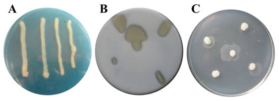 The colony morphology (size, color, and transparency) of strain RB5 was observed on the LB plate. Physiological and biochemical tests including a nitrate reduction, a glucose reaction, citrate, indole, amylolysis, a contact enzyme, methyl, and a Voges Proskauer (VP) test were carried out according to Berger’s Manual of Systematic Bacteriology []. The genomic DNA of strain RB5 was prepared with the modified alkaline lysis method of Yi et al. []. A 16S rRNA gene sequence was amplified with the universal bacterial primers 16SF (5′-AGAGTTTGATCATGGCTCAG-3′) and 16SR (5′-TGAAGTCGTAACAAGGTAACCGT-3′). The conditions for PCR were as follows: 94 °C for 4.0 min, then 32 cycles of denaturation at 94 °C for 50 s, annealing at 53 °C for 1.0 min, and extension at 72 °C for 40 s, followed with a final extension at 72 °C for 8 min. PCR amplification products were verified with 1.0% agarose gel electrophoresis and sequenced by Biomed Co., Ltd. (Beijing, China). Then, 16S rRNA gene sequences were analyzed on the NCBI website (National Center for Biotechnology Information, Bethesda, MD, USA; http://www.ncbi.nlm.nih.gov/Blast (accessed on 4 February 2010) and used for constructing for the phylogenetic tree with the neighbor-joining method by MEGA 7.0 [].