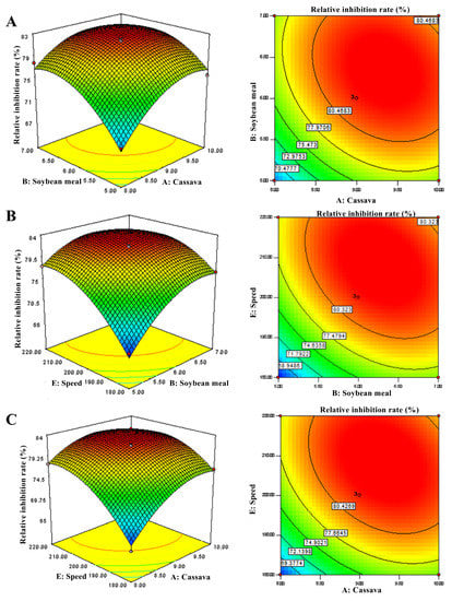 The Box–Behnken test was conducted with three variables of A, B, and E, and the results are shown in Table 4. When the concentration of cassava is 9 g/L, the concentration of soybean meal is 6 g/L, and the speed is 200 r/min; the highest inhibition rate reached up to 82.37%.