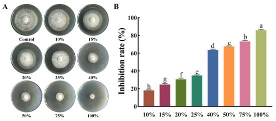 The antifungal activities of the culture filtrate of RB5 were examined with the mycelia growth rate method []. Briefly, strain RB5 was added to 100 mL of the LB broth in the flasks and shaken at 28 °C for 12 h with 200 r/min. Then, a 4% (v/v) aliquot of the RB5 suspension was inoculated into 200 mL of the LB broth and incubated at 28 °C and 180 r/min for 48 h. The cell-free culture filtrate was prepared as described in Section 2.5.1. Then, 2, 3, 4, 5, 8, 10, 15, and 20 mL of the culture filtrate were mixed with sterile water, and made the total volume of 20 mL for preparing the culture filtrate with different concentrations (10%, 15%, 20%, 25%, 40%, 50%, 75%, 100%). In total, 10 mL of the culture filtrate with different concentrations was mixed with 10 mL of the PDA medium and poured onto a flat plate, respectively. Sterile water without the culture filtrate was taken as a control and all experiments were conducted three times. The culture condition and inhibition rate follow Section 2.5.1.