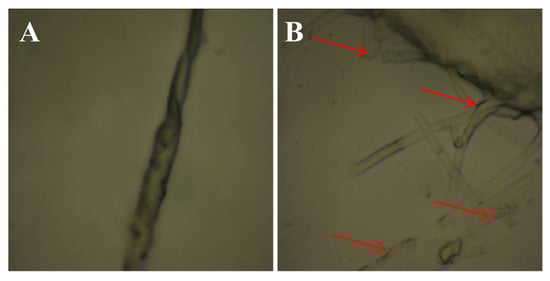 Inhibition of the RB5 culture filtrate on the mycelial morphology of R. cerealis. (A) Control; (B) the culture filtrate of RB5. Red arrows indicate the turgidity or shrinkage of mycelia.