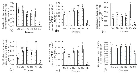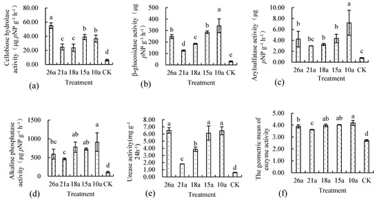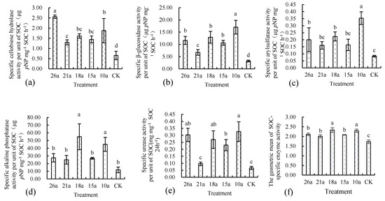 GMEA reflects the overall enzyme activity of the soil of each treatment. Compared with CK, the GMEA of the organic fertilizer treatment was significantly increased by 33.6% to 54.2% (Figure 1). That of the 10a treatment was significantly higher than that of the 26a and 21a treatments. The same trend was observed for SOC-GMSEA and MBC-GMSEA. The SOC-GMSEA and MBC-GMSEA of the organic fertilizer treatments were obviously higher than those of CK, with increases of 16.2% to 34.7% and 45.2% to 61.6%, respectively. The SOC-GMSEA of the 18a and 10a treatments were significantly higher than those of the other organic fertilizer treatments (Figure 2).
