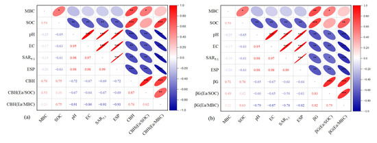 In Figure 4, blue and red represent negative and positive correlations, respectively. The absolute and specific enzyme activities were negatively correlated with pH, EC, ESP, and SAR5:1 but positively correlated with SOC and MBC. Except for alkaline phosphatase, Ea/MBC was more strongly correlated with pH, EC, ESP, and SAR5:1 than absolute enzyme activity, Ea/SOC with pH, EC, ESP, and SAR5:1 (darker and thinner). There was no correlation between EA/MBC and MBC or EA/SOC and SOC. For ALP, the correlation between absolute enzyme activity and pH, EC, ESP, and SAR5:1 was not significantly different from that between specific enzyme activity and pH, EC, ESP, and SAR5:1. The correlation between MBC-GMSEA and pH, EC, ESP, and SAR5:1 was significantly higher than that between GMEA and pH, EC, ESP, and SAR5:1.