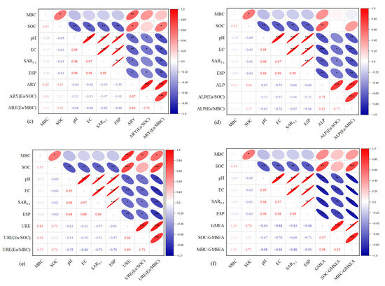 Pearson’s correlation between absolute and specific cellobiose hydrolase (a), β-glucosidase (b), arylsulfatase (c), alkaline phosphatase (d), urease (e), geometric mean of enzyme activity activity (f) and soil property index (MBC, SOC, pH, EC, ESP, and SAR5:1). Notes: CBH is cellobiose hydrolase activity, βG is β-glucosidase activity, ARY is arylsulfatase activity, ALP is alkaline phosphatase activity, URE is urease activity, EA/SOC is soil activity per unit of SOC, EA/MBC is soil activity per unit of MBC, GMEA is the geometric mean of enzyme activity, SOC-GMSEA is the geometric mean of specific enzyme activity per unit of SOC, MBC-GMSEA is the geometric mean of specific enzyme activity per unit of MBC. *, p < 0.05, **, p < 0.01, ***, p < 0.001.