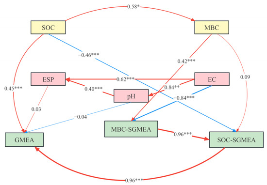 In addition, the structural equation model (SEM) results can well explain the way to affect absolute and specific enzyme activities by saline–alkali properties (Figure 5). We input SOC, MBC, pH, EC, ESP, GMEA, SOC-SGMEA, and MBC-SGMEA into the SEM model and achieved a great fitting level. The causal relationship in different soil variables can be reflected by SEM. The strong collinearity between ESP and SAR5:1 could not meet the precondition of model analysis, and the SAR5:1 variable was removed. SOC had large positive effects on MBC, indicated by the effect coefficient of 0.58. SOC provides energy substances and nutrients required by microbial life activities, and it can also promote the improvement of soil structure and other physical properties, making it conducive to microbial activities. The path coefficients from ESP and pH to GMEA were 0.03 and −0.04; although the effect of ESP on GMEA was positive, it showed a lower effect on enzyme activity, and the effect was not significant. The path coefficient from EC to MBC-SGMEA was −0.84. The contribution of soil saline–alkali properties to MBC-SGMEA was greater. The path coefficient from MBC to MBC-SGMEA was 0.42. Soil microorganisms are important sources of soil enzymes, and in the process of decomposing organic materials, microorganisms produce enzymes that catalyse the mineralization of SOC [38]. Soil microorganisms release extracellular enzymes to perform essential metabolic functions [39]. SOC has a different effect on GMEA (0.45) and SOC-SGMEA (−0.46). In our study, SOC had a positive effect on enzyme activity but had a negative effect on unit organic carbon enzyme activity. To maintain soil metabolism, the utilization rate of enzymes for organic matter increased in the soil with low organic matter content, which showed a negative correlation [24]. SOC decomposition rates are strongly associated with soil enzyme activity [40]. SOC is the most critical physicochemical property affecting GMEA and SOC-SGMEA. Soil enzyme activity is often used as a sensitive index to characterize changes in soil organic carbon content [41]. The most critical property affecting MBC-SGMEA is EC (−0.84). In addition, GMEA, MBC-SGMEA, and SOC-SGMEA are also affected by each other.