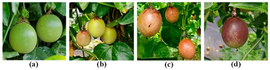 Close-up view of the passion fruit dataset: (a) unripe passion fruit, (b) unripe passion fruit, (c) ripe passion fruit, and (d) fully ripe passion fruit.