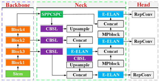 YOLOv7 [9] represents a single-stage model for object detection, surpassing the performance of other algorithms in the YOLO series in terms of both speed and accuracy. This accomplishment can be attributed to its advanced network architecture and the utilization of sophisticated training strategy techniques. Illustrated in Figure 4, the YOLOv7 model inherits the fundamental YOLO object detection network, which comprises three key components: the backbone, neck, and head. The backbone component of YOLOv7 plays a pivotal role in feature extraction. It incorporates a stem element and four sequentially connected blocks, employing the highly efficient ELAN network module [29]. For feature fusion, the neck component leverages the Path Aggregation Network (PANet) [30]. As for feature decoding, the head component employs a structural reparameterization approach based on gradient flow propagation path analysis. This includes the integration of a redesigned reparameterization convolution network known as RepConv. Collectively, these three components are synergistically combined in YOLOv7 to yield enhanced performance in various object detection tasks.