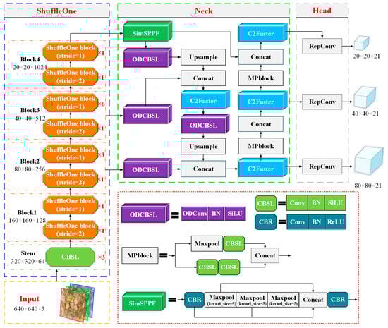 The network model proposed in this study, FSOne-YOLOv7, showcases an architecture based on YOLOv7, as depicted in Figure 5. Notably, it introduces a redesigned backbone termed ShuffleOne, which encompasses a sequence of ShuffleOne blocks, effectively replacing the original backbone. Additionally, a streamlined and efficient slim-neck replaces the initial neck component. The ShuffleOne block, renowned for its lightweight nature and high efficiency, serves as the building block within ShuffleOne. Its primary objective is to swiftly capture the diverse appearance features of passion fruit, particularly in intricate environments. The ShuffleOne’s stem comprises a mere three CBSL structures, while each block comprises a stride = 2 ShuffleOne block and a variable number of stride = 1 ShuffleOne blocks. A CBSL structure encompasses a convolution layer (Conv), batch normalization layer (BN), and Silu activation function layer (Silu). Moreover, the slim-neck is carefully crafted by considering various convolution methods, feature fusion structures, and spatial pyramid pooling structures (SPP) [31], effectively replacing the original neck. Within the slim-neck, the E-ELAN module is substituted with the C2Faster module to minimize redundant computations and memory access. The ODConv module is introduced to augment the acquisition of contextual and spatial information. Eventually, the original SPPCSPC module is replaced with SimSPPF to achieve accelerated inference speeds. In conclusion, this study presents the FSOne-YOLOv7 model, which offers real-time detection capabilities specifically tailored for passion fruit. This is achieved by substituting the original backbone and neck of YOLOv7 with ShuffleOne and a slim-neck, respectively.