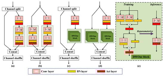 The structure diagrams of the ShuffleNetV2 block and ShuffleOne block. (a,b) are the basic unit structure diagrams of the ShuffleNetV2 block with stride = 1 and stride = 2, respectively. (c,d) are the basic unit structures of the ShuffleOne block with stride = 1 and stride = 2, respectively. (e) represents the different structures of the DWOne block during training and inference. This module serves as the basic unit for the structural reparameterization of the depth-wise separable convolution (DWConv). The sizes of the convolutional kernels are denoted as 1 × 1 and 3 × 3, and the “d” in (e) indicates the depth-wise convolution operation. The act layer applies the ReLU activation function.
