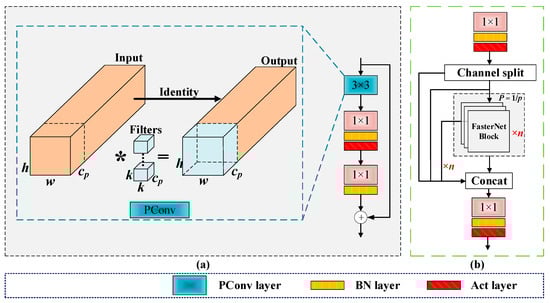 The integration of the Faster Block brings forth enhanced feature extraction capabilities and improved latency performance. This block encompasses a partial convolution (PConv) layer along with two consecutive 1 × 1 convolutional layers, resulting in an inverted residual structure, as demonstrated in Figure 7a. The Conv 1 × 1 layer effectively leverages information from all channels, while the channel expansion in the middle layer necessitates the inclusion of a “Shortcut” to reuse input features and mitigate the issue of gradient divergence in deep networks. The PConv operation, depicted in Figure 7, follows a straightforward, swift, and efficient convolutional approach. It selectively applies the conventional convolution operation to a subset of input channels for spatial feature extraction while keeping the remaining input channels unaltered. This technique effectively reduces redundant computations and minimizes memory access requirements.