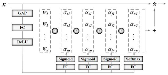 A schematic of an omni-dimensional dynamic convolution [46]. GAP: global average pooling; FC: fully connected layer; Wi: convolution kernel; : kernel space dimension position; : channel mode of input channel dimension; : filter mode of output channel dimension; : the kernel dimension of the convolution kernel space and the kernel dimension of the space where i ranges from 1 to n; the symbols ‘+’ and ‘*’ represent addition and convolution operations respectively.