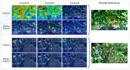 To offer a more comprehensive assessment of the benefits of ShuffleOne and the slim-neck module in the domains of feature extraction and fusion, a comparative analysis between YOLOv7 and FSOne-YOLOv7 models is presented in Figure 11. The utilization of Grad-CAM heatmaps revealed that FSOne-YOLOv7 surpasses YOLOv7 in terms of its proficiency in feature extraction. The backbone component of the YOLOv7 model exhibited shortcomings in effectively eliminating extraneous background information. Conversely, the FSOne-YOLOv7 model surmounted this limitation by adeptly filtering out superfluous background details, thereby accentuating the distinctive appearance features specific to passion fruit. These findings substantiate the notion that ShuffleOne confers benefits upon feature extraction while augmenting the interpretability of the exhibited results. Appraising the results presented for each block, it becomes evident that the FSOne-YOOv7 model initially emphasized the elliptical visual attributes inherent to passion fruit, gradually discarding background traits that resembled the fruit’s color, progressively intensifying the attention surrounding the fruit area and ensuring maximal concentration of attention upon the fruit. Finally, by capitalizing on the fruit’s appearance characteristics, attention was directed towards the salient regions of interest. In addition, the distinct modules within slim-neck manifested divergent influences on feature fusion. Slim-neck1 manifested commendable results in fusion, whereas slim-neck2 introduced ODConv to bolster the fusion of contextual information, thereby expanding and focalizing attention upon both unripe and ripe regions of passion fruit. Moreover, slim-neck3 further optimized the results of fusion by accentuating the emphasis on the central position of the fruit. These results unequivocally demonstrate the pivotal roles played by ShuffleOne and slim-neck in feature extraction and fusion, substantiating their capacity to enhance the performance of the FSOne-YOOv7 model.