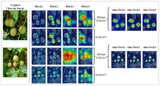 Visual effect diagram of the effect of different modules on the model. The left section displays close-up images of the original passion fruit. In the middle section, each row represents the visualization results of a model, and each column represents the Grad-CAM effect of each block layer in the backbone of FSOne-YOLOv7 and YOLOv7. On the right side, the optimal Grad-CAM effect images are shown for FSOne-YOLOv7 using different slim-neck configurations (slim-neck1 represents the introduction of only C2Faster, slim-neck2 represents the introduction of C2Faster and ODConv, and slim-neck3 represents the introduction of C2Faster, ODConv, and SimSPPF).