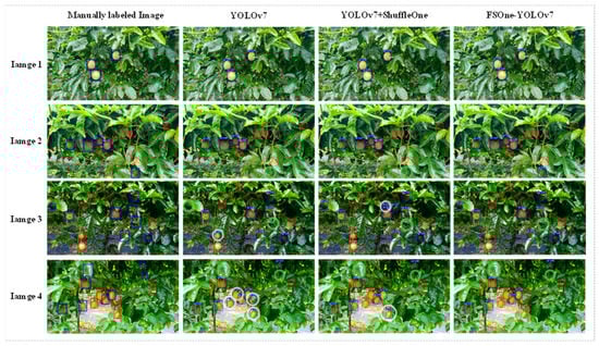 In the overall evaluation, when compared to the different detection methods, FSOne-YOLOv7 demonstrated a reduced occurrence of missed and false positive detections for passion fruit. It showcased superior performance and proved more suitable for addressing the challenges posed by the complex growth environment and diverse appearance characteristics of passion fruit.