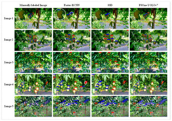 Comparison of detection performance among different methods. Red rectangular boxes represent the predicted results for unripe passion fruit, while blue rectangular boxes represent the predicted results for mature passion fruit. The green circles indicate missed passion fruit targets and the white circles represent falsely detected passion fruit objects.