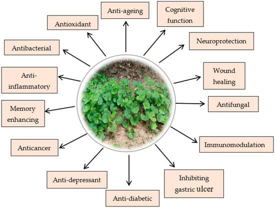 - Biswas, D.; Mandal, S.; Chatterjee Saha, S.; Tudu, C.K.; Nandy, S.; Batiha, G.E.S.; Shekhawat, M.S.; Pandey, D.K.; Dey, A. Ethnobotany, Phytochemistry, Pharmacology, and Toxicity of Centella asiatica (L.) Urban: A Comprehensive Review. Phyther. Res. 2021, 35, 6624–6654. [Google Scholar] [CrossRef] [PubMed]