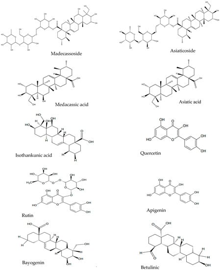 - Shukla, A.; Rasik, A.M.; Jain, G.K.; Shankar, R.; Kulshrestha, D.K.; Dhawan, B.N. In Vitro and in Vivo Wound Healing Activity of Asiaticoside Isolated from Centella asiatica. J. Ethnopharmacol. 1999, 65, 1–11. [Google Scholar] [CrossRef]