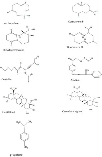 - Oyedeji, O.A.; Afolayan, A.J. Chemical Composition and Antibacterial Activity of the Essential Oil of Centella asiatica Growing in South Africa. Pharm. Biol. 2005, 43, 249–252. [Google Scholar] [CrossRef]