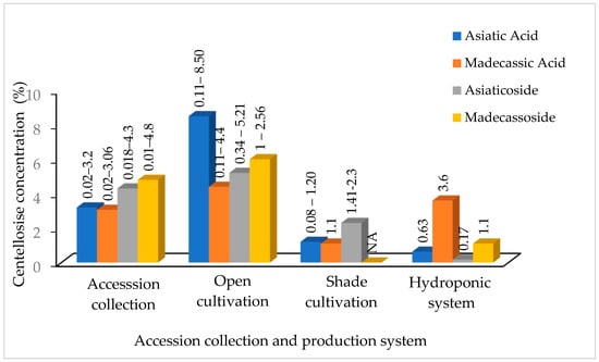 | WP | SD | - | Open agricultural land Asiaticoside (1.91%), asiatic acid (0.13%) Partially shaded grassland Asiaticoside (1.41%), asiatic acid (0.08%) Open grassland Asiaticoside (1.71%), asiatic acid (0.07%) | [105] |