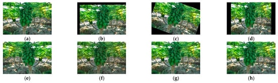 Papaya image data enhancement method. (a) Origina. (b) Translational transformation. (c) Random rotation. (d) Random scaling. (e) Horizontal mirroring. (f) Splash noise. (g) Defocus blur. (h) Motion blur.