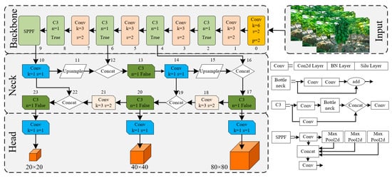 The YOLOv5s architecture comprises the input, backbone network, neck network and prediction head. The input side uses mosaic data augmentation, adaptive anchor frame calculation and adaptive image scaling. The backbone network utilises various feature extraction modules, such as Conv, C3, and SPPF. The SPPF role is to achieve the fusion of local and global features at the featherMap level. The neck network employs the PANet structure [28] for multiscale feature fusion and enhanced feature extraction. The prediction head uses complete intersection over union (CIOU) loss [29] to calculate the bounding box loss, and BCE loss to calculate the confidence loss and classification loss. The structure of the original YOLOv5s network model is shown in Figure 2.