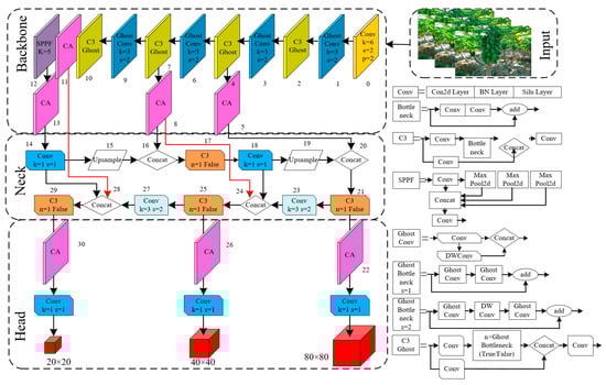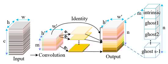 The Ghost module is a technique that can replace convolutional operations in traditional CNN networks, providing a means of implementing lightweight neural networks [30]. The Ghost module reduces the number of network model parameters and floating-point operations (FLOPs) whilst maintaining the algorithm’s performance capability.