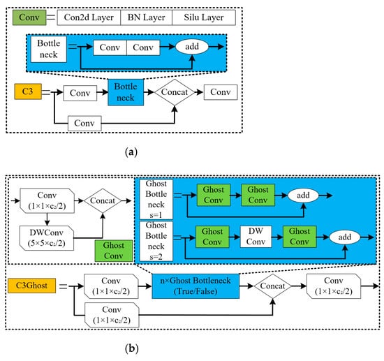 From Equations (1) and (2), the Ghost module reduces the computational and parametric volume of the convolution process compared with normal convolution. In the original YOLOv5 network model, a large number of Conv and C3 modules are found in the backbone network layer, which involve a large number of operations and parameters. The model becomes lighter by using the Ghost module to improve the Conv and C3 modules in the backbone network layer of the YOLOv5s network model. The structure of the model before and after the improvement is shown in Figure 4 and is named GhostConv and C3Ghost, respectively.