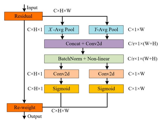 The structure of the coordinate attention module is shown in Figure 5. The coordinate information embedding takes input X. Each channel is encoded along horizontal and vertical coordinates using pooling kernels of size (H, 1) or (1, W), respectively. Thus, the output of the cth channel with height h can be expressed as Equation (3).