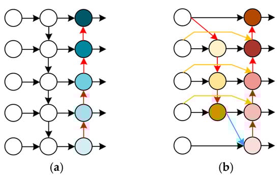 PANet and BiFPN structures. (a) PANet. (b) BiFPN. Notes: “○” denotes the network layer and “→” denotes the connection relationship between the network layers.