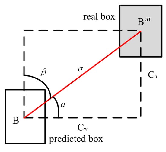 where ch is the height difference between the centres of the ground truth box and the predicted box, σ is the distance between the centres of the ground truth box and the predicted box, is the centre of the ground truth box, and B is the centre of the predicted box.