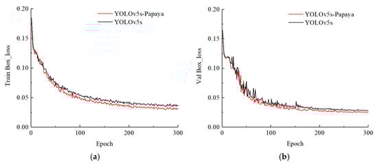 The same dataset and the same parameter settings were used during the training of both the improved YOLOv5s and YOLOv5s-Papaya models. The comparison curves of the bounding box loss functions for the two models were plotted by analysing the log files saved during the training process, as shown in Figure 9.