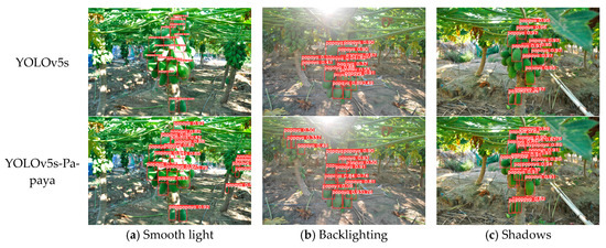 To investigate the detection performance of the improved YOLOv5s model for dense multitarget papaya under different lighting scenes, we selected papaya images taken in down-light, back-light, and shadow scenes for the experiments. The detection results are shown in Figure 10.