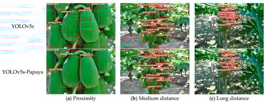 To investigate the detection performance of the improved YOLOv5s model for dense multitarget papaya under different fields of view, we conducted experiments using papaya images taken in three field-of-view scenarios: close range (0.2 m to 0.5 m), medium range (0.5 m to 1.0 m), and long range (1.0 m to 2.0 m). The detection results are shown in Figure 11.