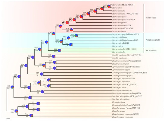 The concatenated and ASTRAL trees based on the two datasets were largely congruent except for several nodes near the tips (Figure 2A and Figure S2). All phylogenetic trees showed a monophyletic Morus as defined by Gardner et al. [5] (BS = 100; LPP = 1), consisting of three major lineages: M. notabilis was fully supported as sister to the American clade + the Asian clade (BS = 100, LPP = 1; Figure 2A and Figure S2). The American clade with full support included three species, with the lineage of M. celtidifolia + M. microphylla Buckley sister to M. rubra (BS = 100, LPP = 1) in all phylogenetic trees of the two datasets.