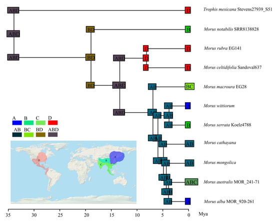 We compiled the distribution information for each Morus species based on Zhou and Gilbert [1], Wunderlin [52], and Plants of the World Online (https://powo.science.kew.org/, accessed on 1 September 2022). Given the extant distribution of Morus and the floristic delineations proposed for Asia [53,54], we delimited four biogeographic regions: (A) Sino-Japan, including most of China, Mongolia, Japan, and Korea; (B) Sino-Himalaya, including the Hengduan Mountains and the Qinghai–Tibet Plateau (i.e., Yunnan, Tibet, and western Sichuan) of China, Bhutan, Nepal, and the Himalayan area of India; (C) Southeast Asia, including Southeast China (i.e., Guangdong, Hainan, and Taiwan), India, Indonesia, Malaysia, Myanmar, Sikkim, and Thailand; and (D) the Americas.