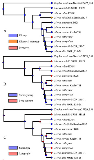 To explore morphological evolution in Morus, we conducted ancestral reconstruction for three reproductive characters: breeding system, syncarp length, and style length. The morphological characters were collected from Zhou and Gilbert [1], Wunderlin [52], and Berg [56] (Table 1; Table S1). Following Zhou and Gilbert [1] and Koidzumi [2], we scored (1) the breeding system as either monoecy, dioecy, or dioecy and monoecy; (2) the syncarp length as short (equal and less than 2.5 cm) or long (more than 2.5 cm); and (3) the style length as short (equal and less than 2 mm) or long (more than 2 mm). The consensus dated tree from the simplified C157 dataset from treePL was used for ancestral sate reconstruction but was pruned to retain only the sister group of Morus, T. mexicana. Ancestral character states were estimated using the continuous-time Markov chain (Mk) model in phytools v1.0-3 [57].