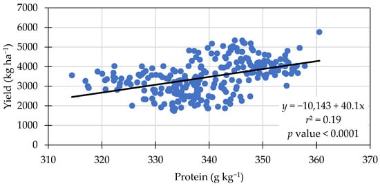 A significant positive linear relationship between protein content and yield was observed (Figure 1). Similarly, in a soybean production study comparing dry land to irrigated land, soybean yield and protein content were both increased under irrigated fields [35]. A possible explanation is that at the time of partitioning N, there was enough available N and moisture in the soil for plants to fill the seeds and increase protein content; however, most researchers have found different results, where the protein was negatively correlated to yield [36,37,38,39], or no relationship between the two traits was observed [40].